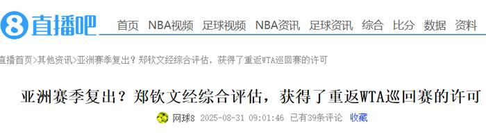 就在8月31日这一天,国内媒体称郑钦文的身体已经完全康复,她得到了重返WTA巡回赛的许可,只要愿意随时都可以重返赛场。